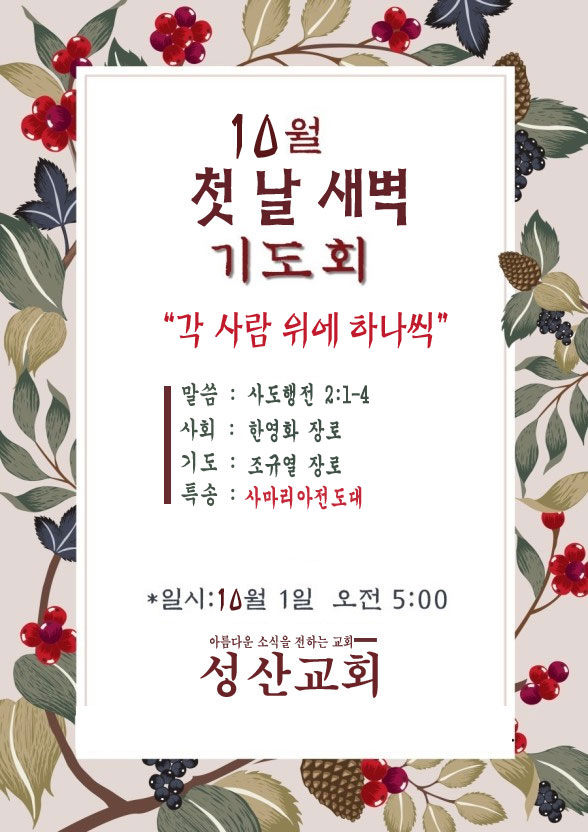 공지 | 10월 첫 날 예배 페이지 정보 작성자 최고관리자 작성일25-09-30 18:31 조회220회 댓글0건 관련링크 이전글 다음글 목록 글쓰기 본문 * SNS공유 댓글목록 등록된 댓글이 없습니다. 이전글 다음글 목록 글쓰기