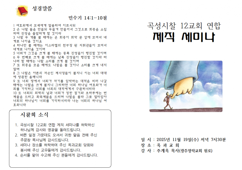 공지 | 11.20 제직 세미나 페이지 정보 작성자 최고관리자 작성일25-11-22 18:37 조회155회 댓글0건 관련링크 이전글 다음글 목록 글쓰기 본문 * SNS공유 댓글목록 등록된 댓글이 없습니다. 이전글 다음글 목록 글쓰기